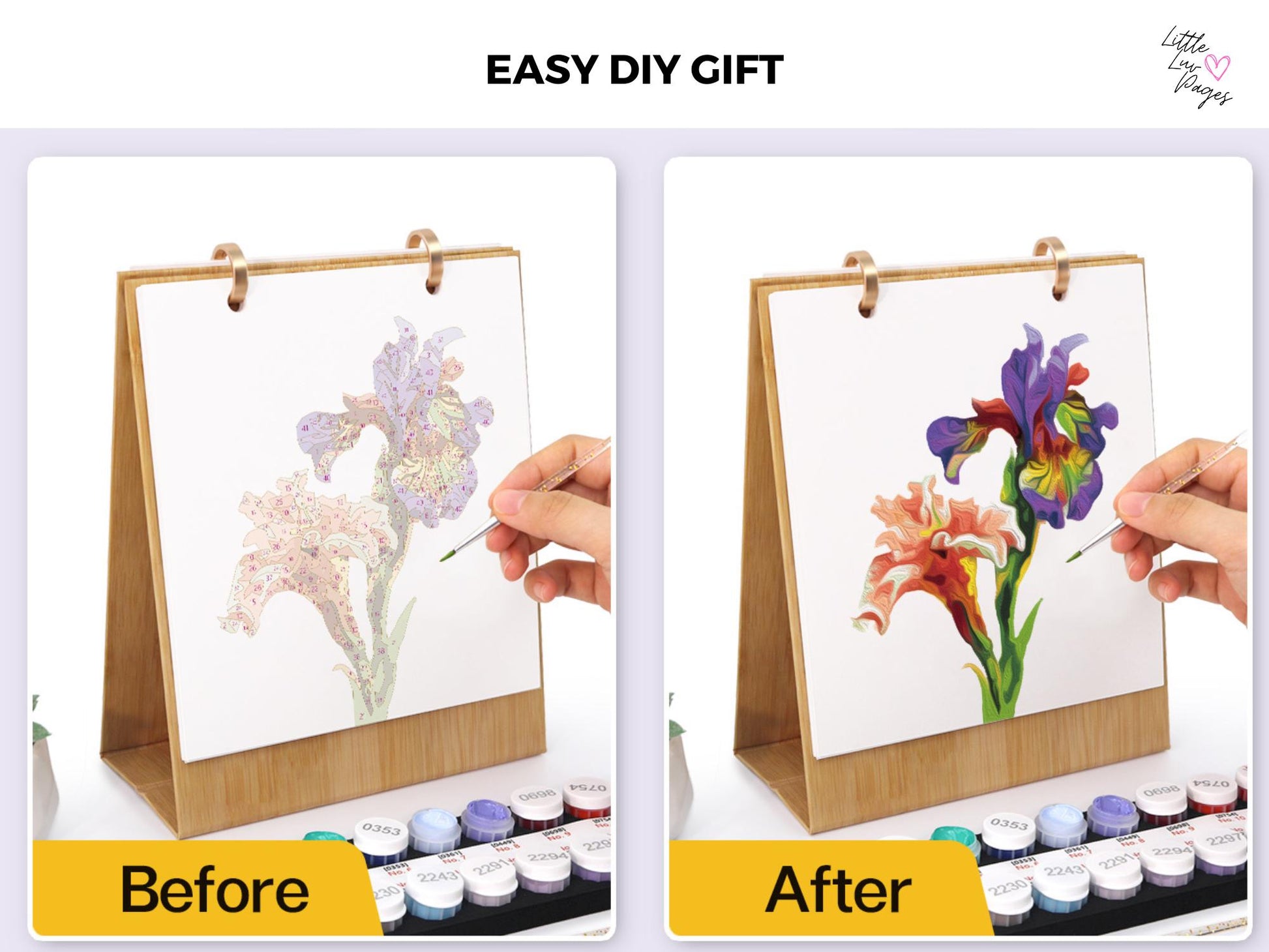 Each kit includes a canvas with a numbered design. Simply match the paint to the corresponding number, dip your brush, and bring your artwork to life. Then sit back and enjoy the beauty of what you've created.